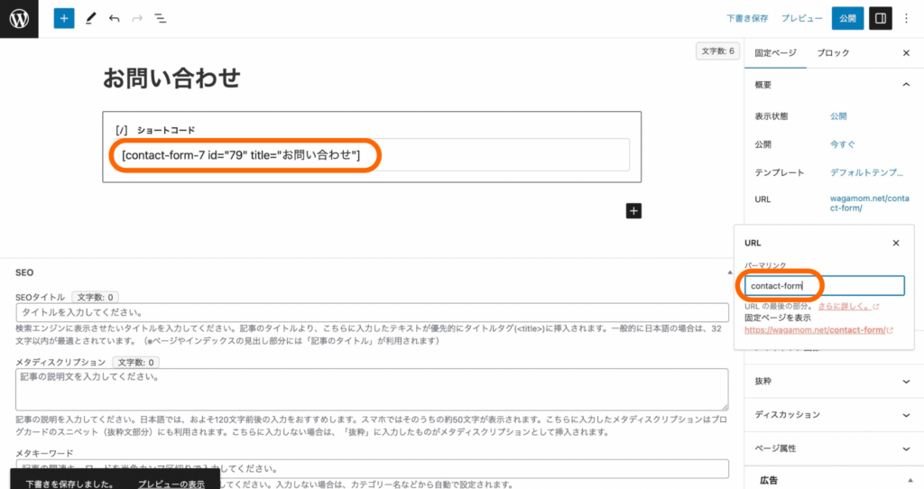 出てきたブロックに先ほどコピーしたショートコードをペーストし、右側のパーマリンクには「contact-form」と入力します。