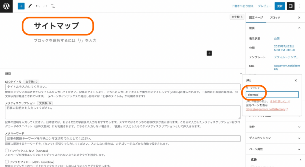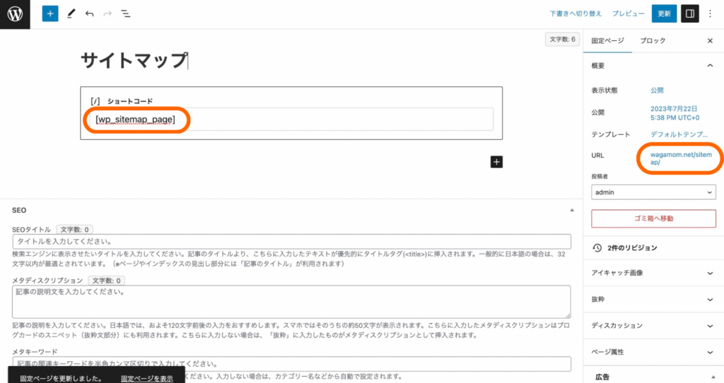 一旦右上から「下書き保存(更新)」してパーマリンクを「sitemap」に変更し、先ほどコピーしたショートコードをペーストして「公開」すれば完了です!
