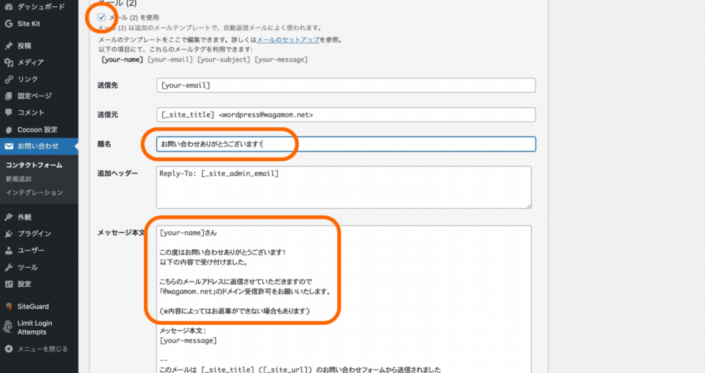 [your-name]さん この度はお問い合わせありがとうございます! 以下の内容で受け付けました。 こちらのメールアドレスに返信させていただきますので 「@wagamom.net」のドメイン受信許可をお願いいたします。 (※内容によってはお返事ができない場合もあります)