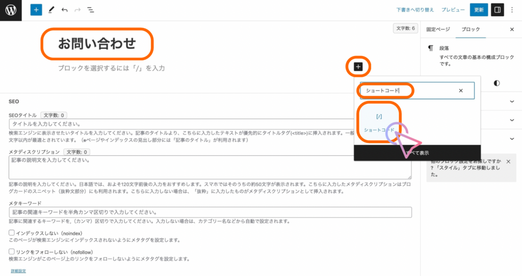 タイトルには「お問い合わせ」と入力し、ブロックの右側の+ボタンから「ショートコード」と検索してショートコード用ブロックを追加します。