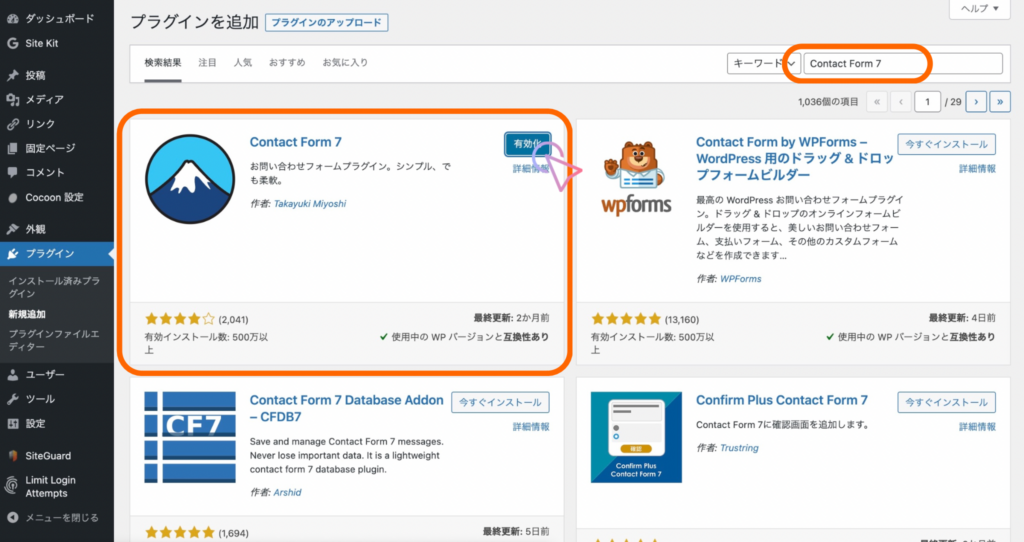 メニューの「プラグイン」→「新規追加」から、右上の検索窓に「Contact Form 7」と入力し、「インストール」→「有効化」をクリック。