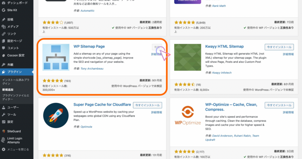 メニューの「プラグイン」→「新規追加」→右上から「WP Sitemap Page」で検索する