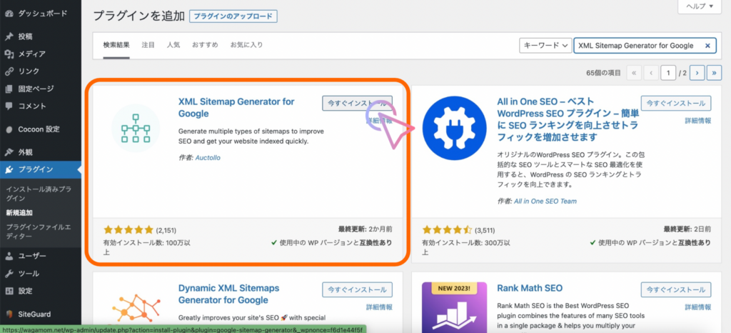 メニューの「プラグイン」→「新規追加」→「XML Sitemap Generator for Google」で検索