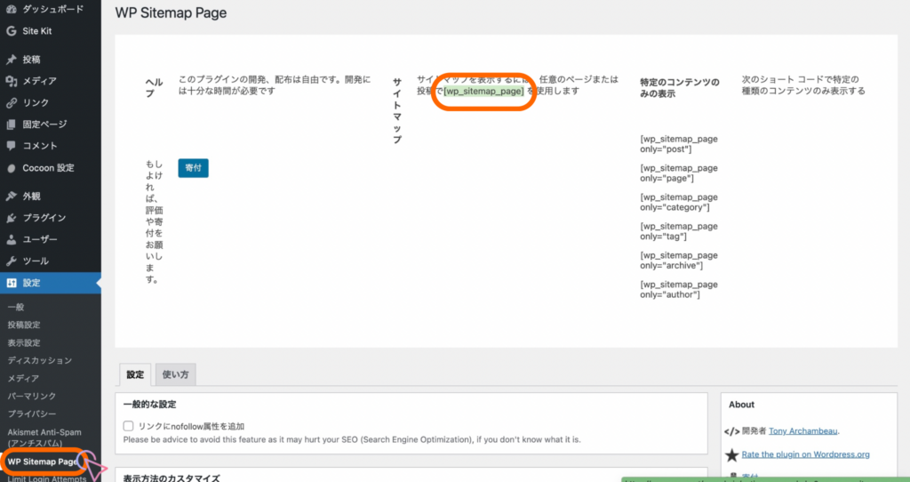 有効化ができているとメニューの「設定」に「WP Sitemap Page」が追加されるので、ショートコード「[wp_sitemap_page]」をコピーしておきます。(※こちらの記事のコードはコピーするとエラーになります)