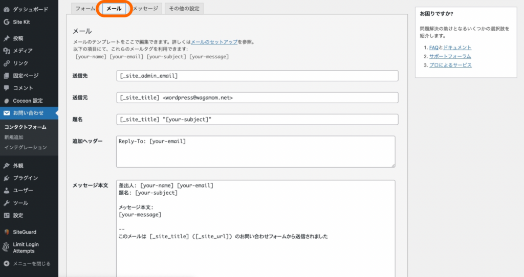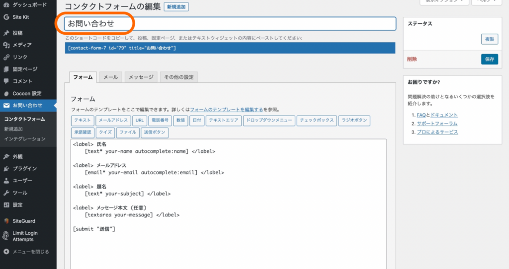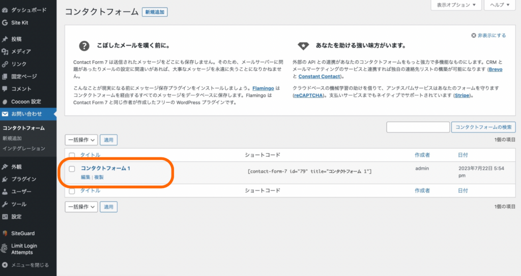 有効化ができていれば、メニューに「お問い合わせ」が追加されるので、「コンタクトフォーム1」を編集していきます。