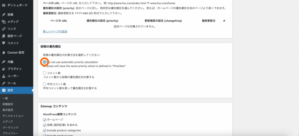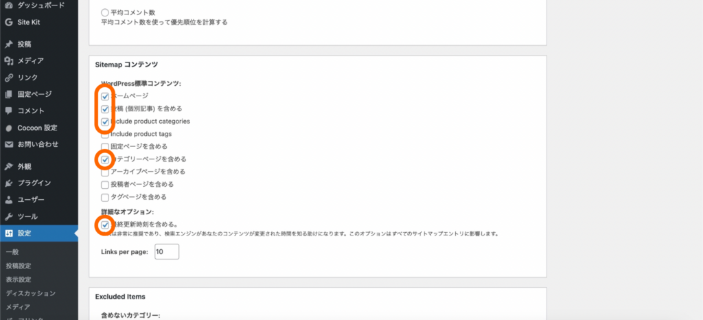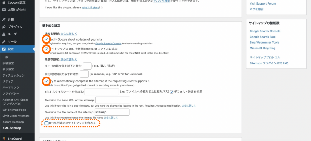 次ステップで解説するサーチコンソールにエラーが発生することがあるため、「HTML形式でのサイトマップを含める」のチェックは外します。