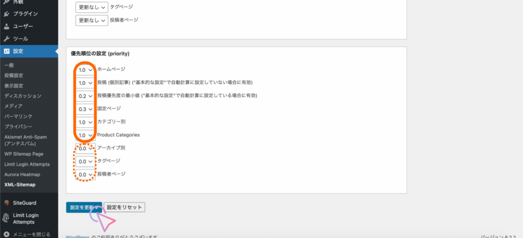 基本は上にならってOKですが、変更したいものがあれば好きにいじっちゃってください。「投稿(個別記事)」だけは確実に「毎日」にしてさえいればOKです。