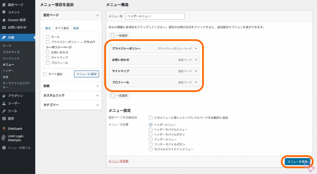 4つの固定ページが追加されていることが確認できたら「メニューを保存」をクリックして完了です!