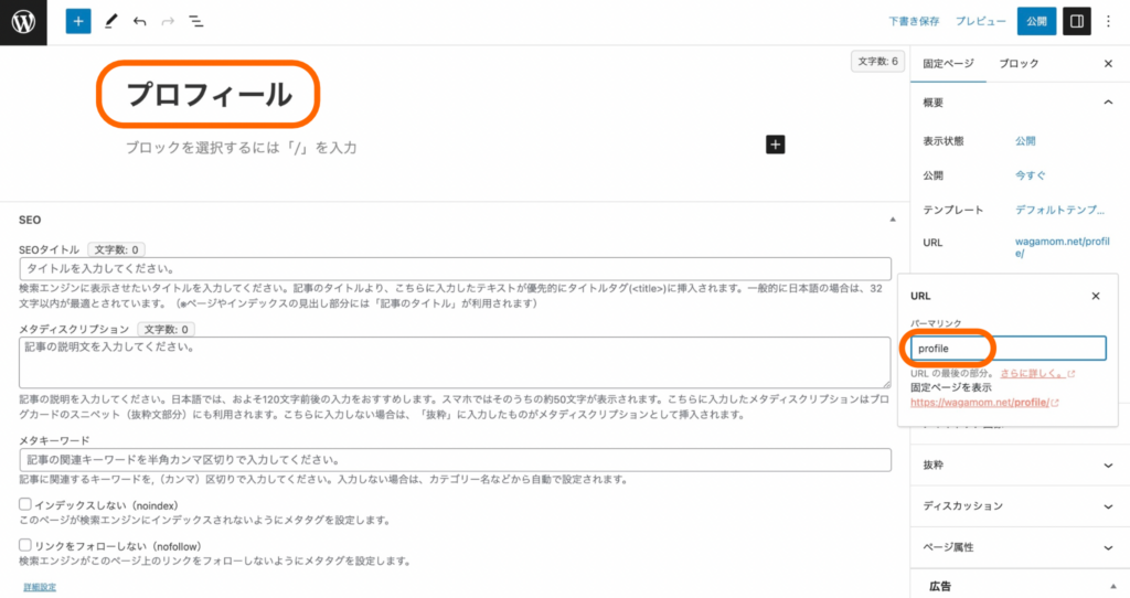 タイトルは「プロフィール」と入力し、いったん右上の「下書き保存(更新)」を押すとパーマリンクが編集できるようになるので、パーマリンクに「profile」と入力します。