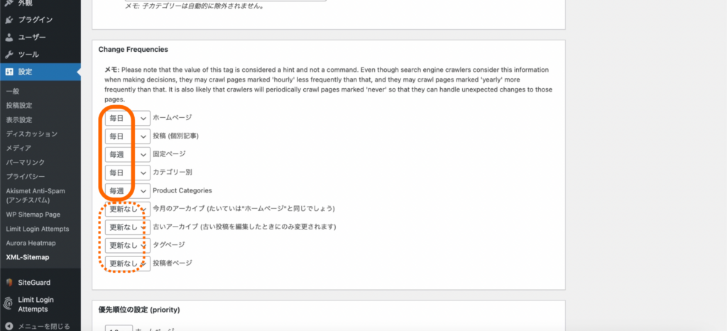 『Googleさん、私のブログのこの部分はこれぐらいの頻度でチェックして〜』というイメージです。ただしこれはあくまでもお願いのようなものなので、絶対にこの頻度になるわけではないので注意。