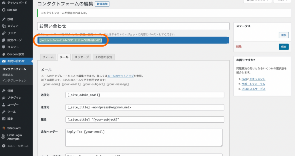 保存ができたら、上部に表示されているショートコードをコピーします。