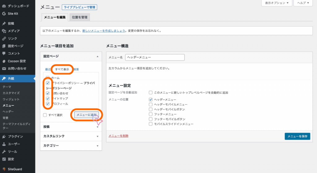 4つの固定ページができたら、これをトップページ上部に表示させる(ヘッダーメニュー)設定をします。