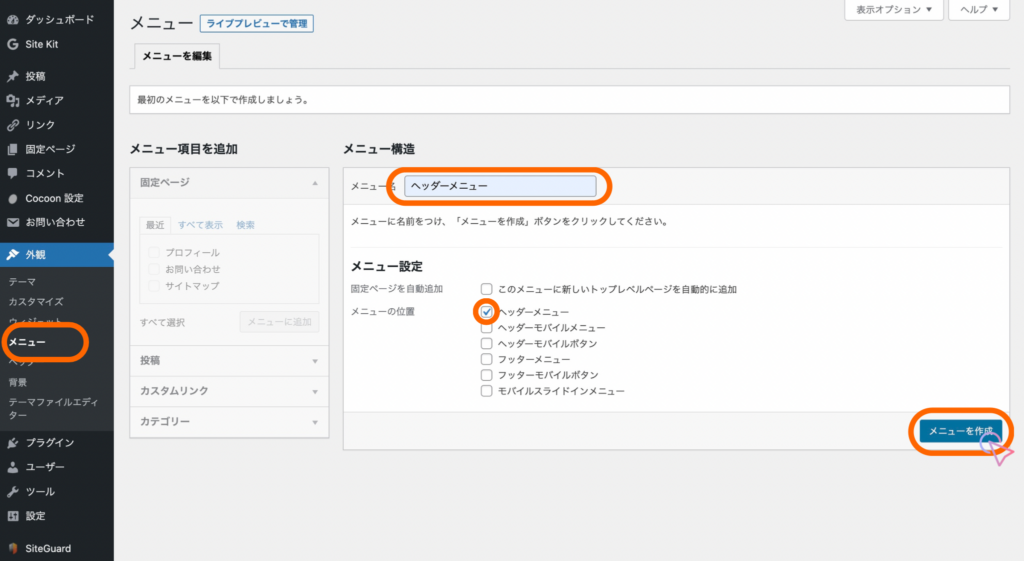 こちらが作成できたら、ヘッダーメニューの設定します。