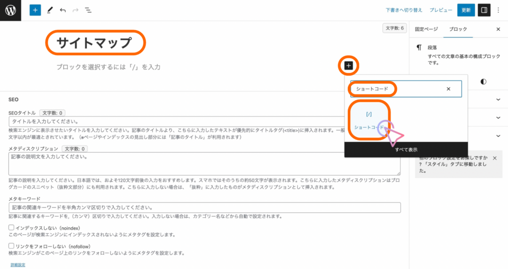 プロフィールの時と同じ要領で、メニューの「固定ページ」→「新規追加」をクリックし、タイトルは「サイトマップ」にしてショートコードのブロックを追加します。